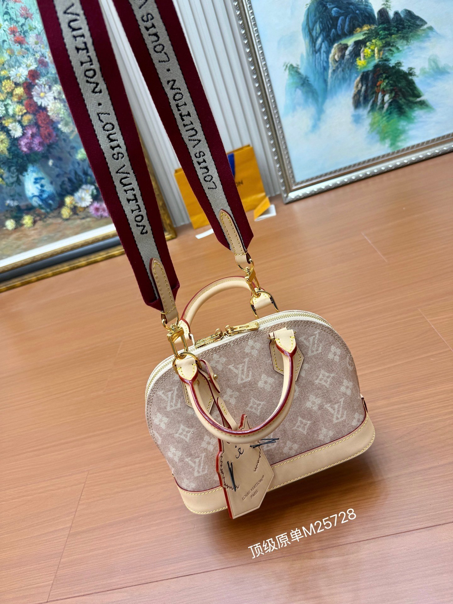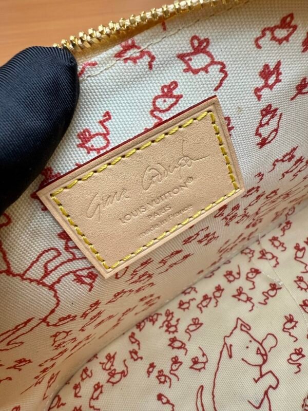 This Alma BB bag from the Travels With Grace Coddington collection, a collaboration between Louis Vuitton and Grace Coddington, features the playful Meowgram motif. The canvas body is trimmed with calf leather, while the fabric shoulder strap displays the “Louis Vuitton” name in Coddington’s handwriting. The refined padlock and key pouch further showcase the brand’s exceptional craftsmanship. Meowgram coated canvas Cowhide leather lining Fabric lining Metal hardware Internal patch pocket Key pouch Padlock Metal studs Holds smartphone, Lisa wallet, keys, and lipstick Shoulder strap: Detachable, non-adjustable Dimensions: 23.5 x 17.5 x 11.5 cm