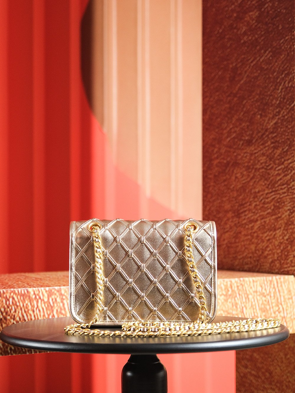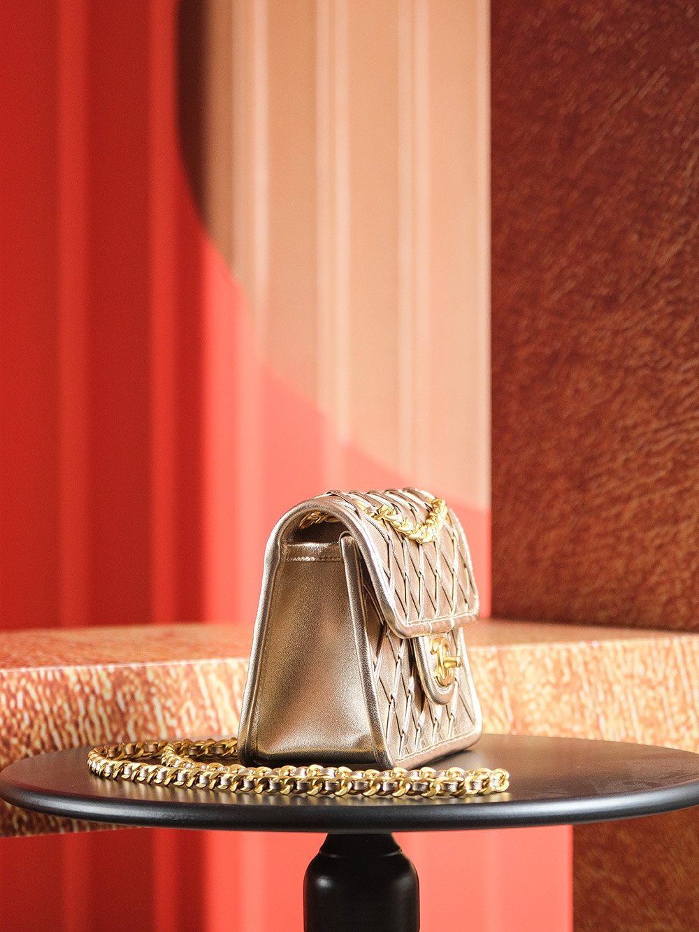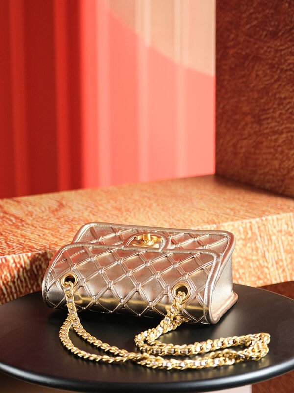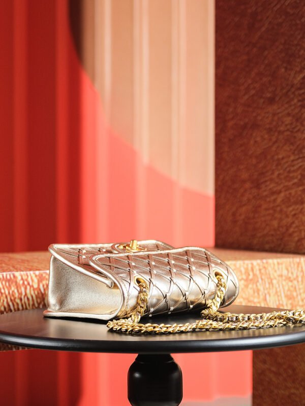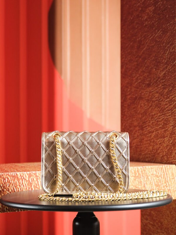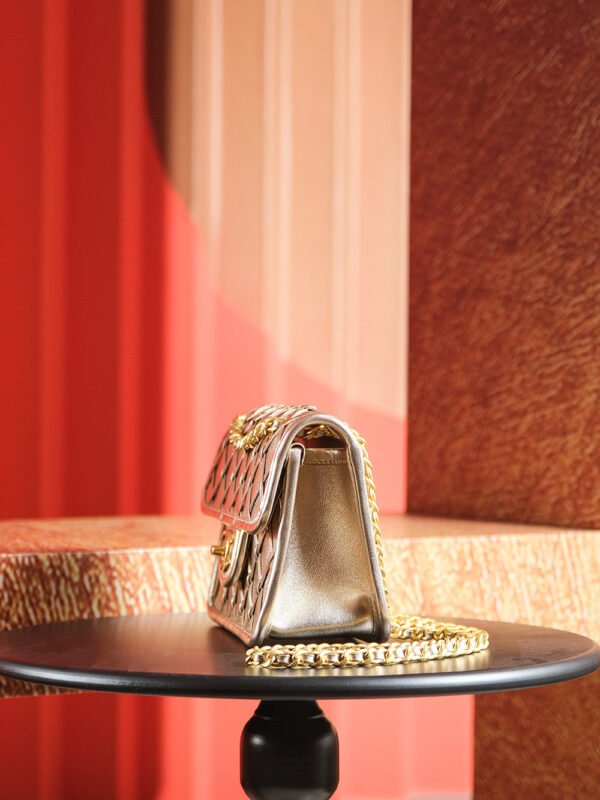 The bag’s material boasts substantial texture, while exquisite metallic accents add a touch of luxury to its silhouette.
