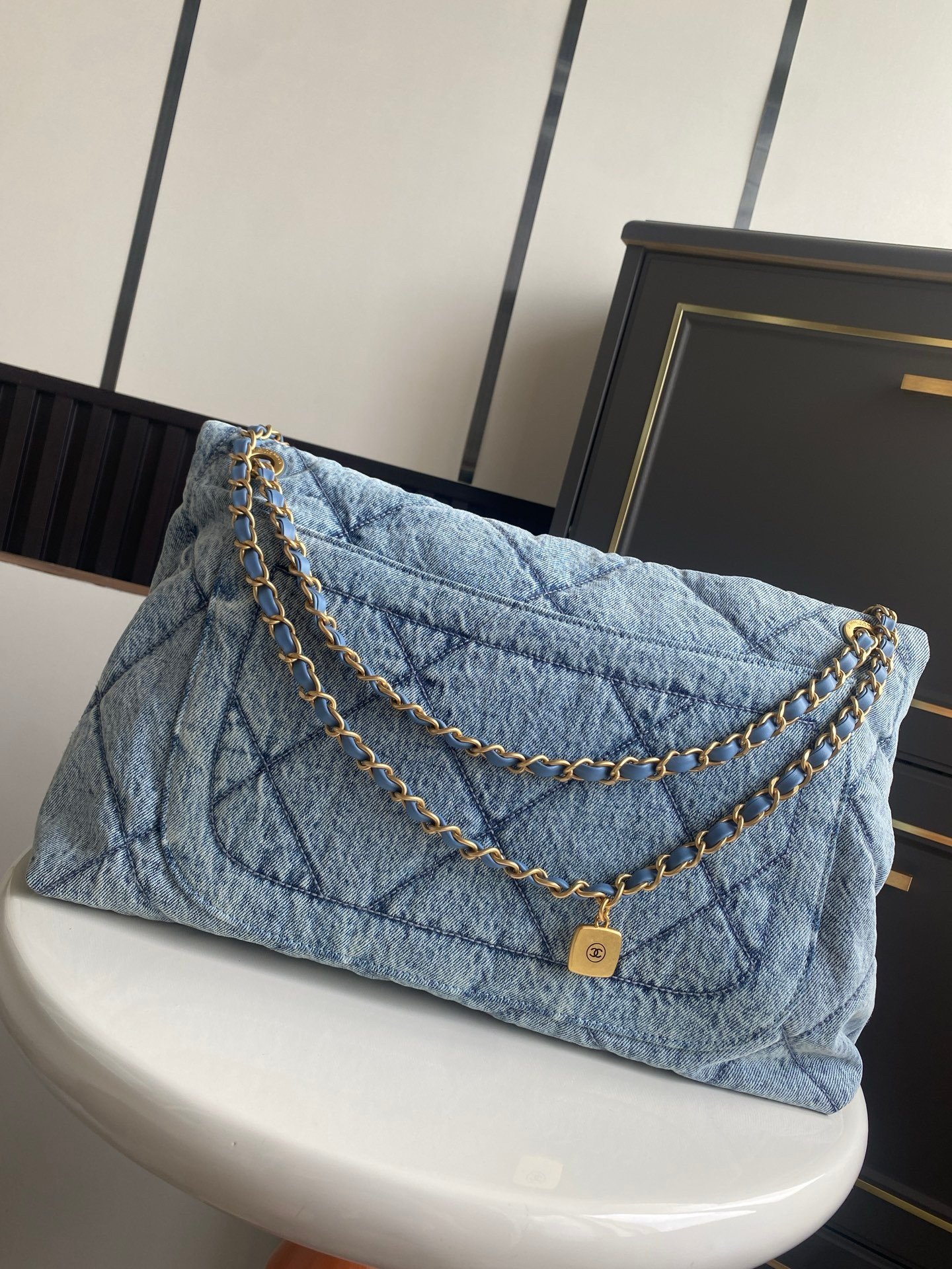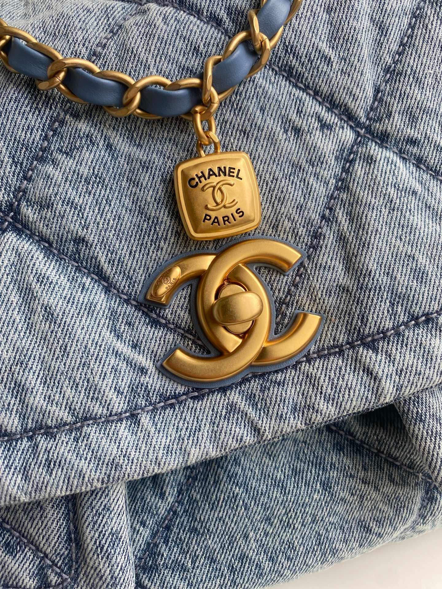 Ultra-luxurious feel—utterly irresistible! Denim paired with gold hardware, dual pockets, and a vintage chain pendant elevate the style. Instantly transforms the classic quilted pattern into a retro-chic statement. The gold double C logo shines brilliantly against the large flap, blending timeless elegance with a fresh twist. Soft, supple leather glides smoothly—exuding sophistication and grace. Highly practical with ample capacity. Stunning when worn.