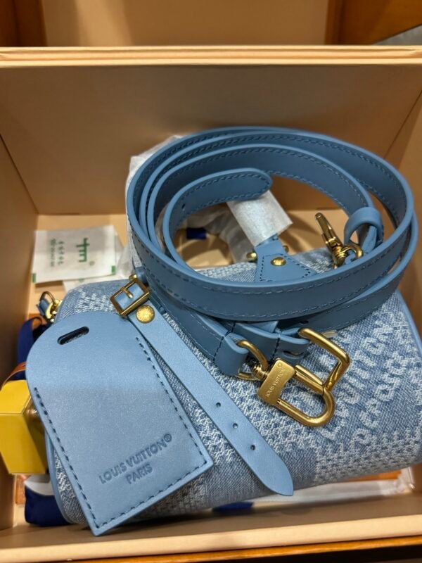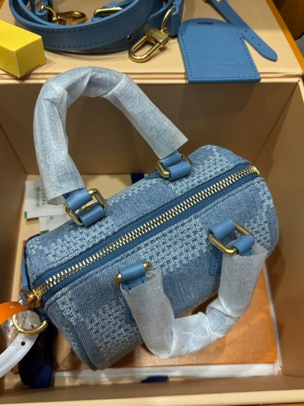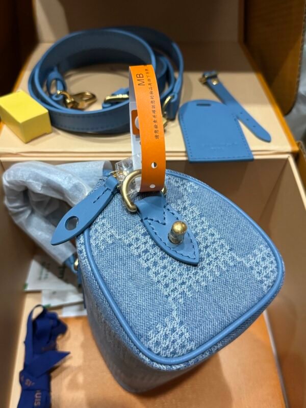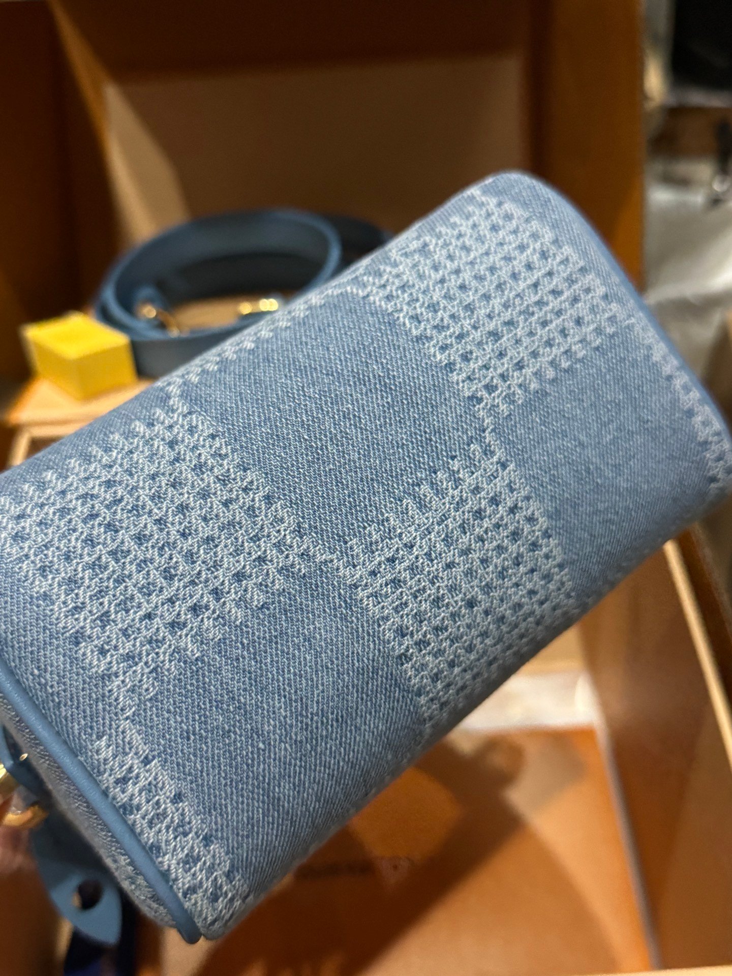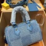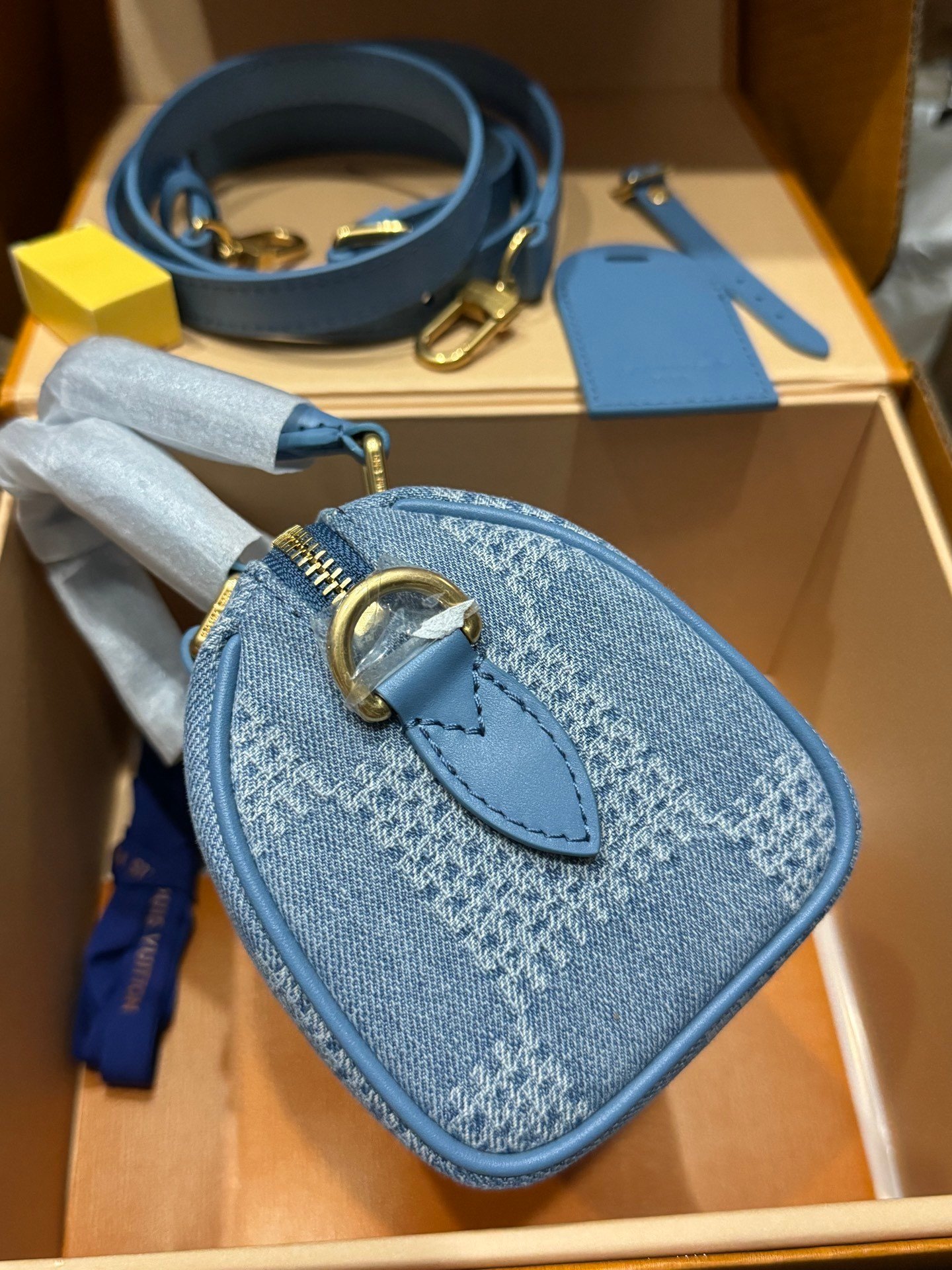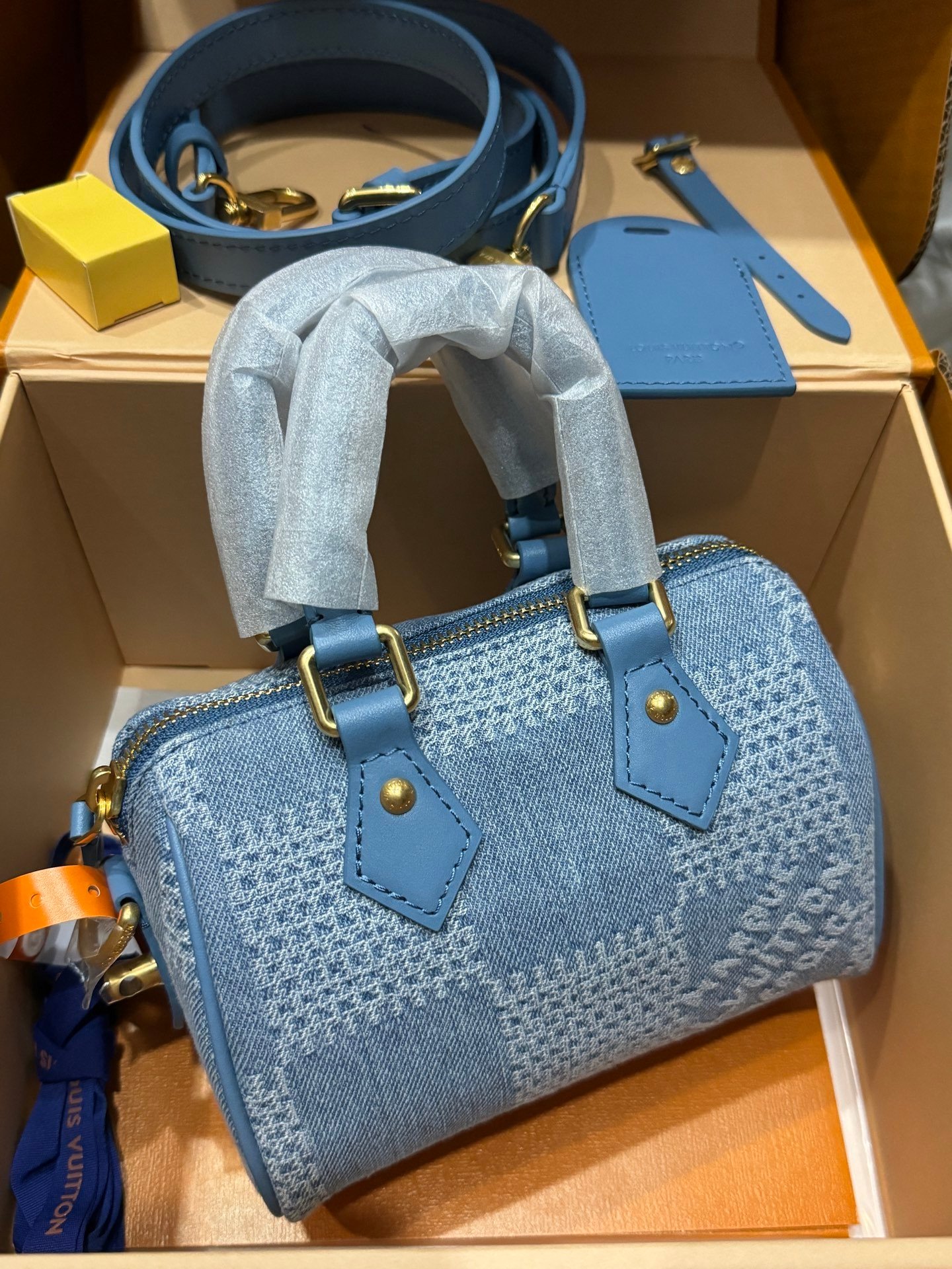 Top-tier authentic channel version, 163 chip, semi-steel hardware. This N00208 Speedy 18 Bandoulière handbag features Damier Denim 3D cotton canvas with leather trim and dazzling metal accents. Pharrell Williams reimagines the iconic check pattern with a retro Marque L.Vuitton Deposée logo, paying homage to the brand’s original Damier motif. The removable and adjustable strap allows for versatile shoulder or crossbody carry.