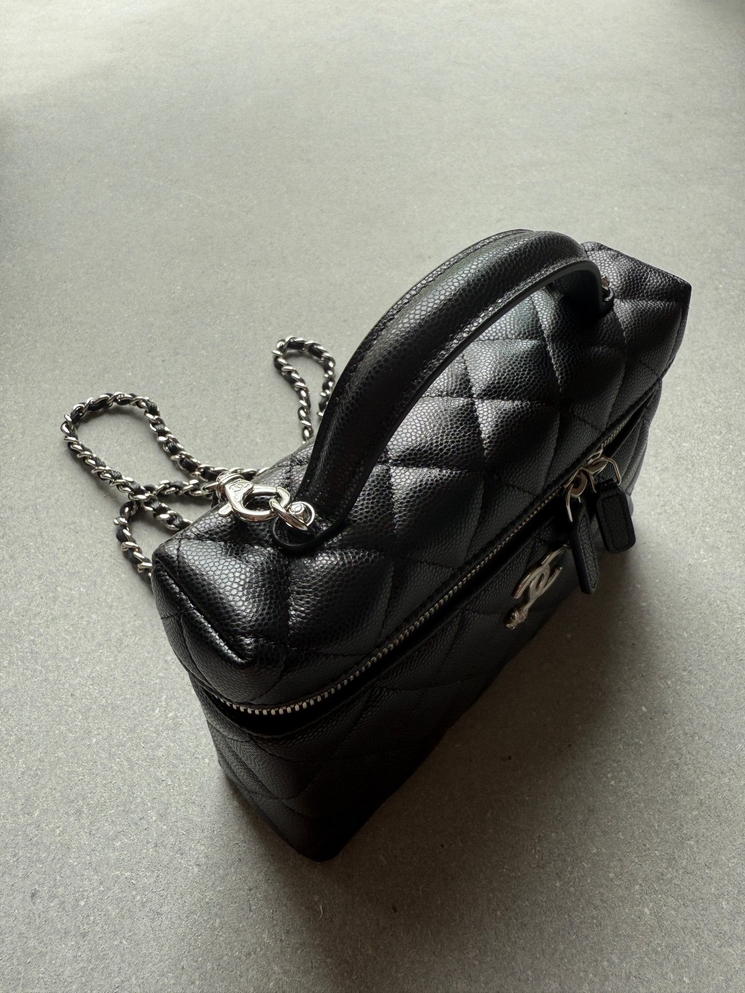 Authentic caviar-grain calf leather exterior and grained cowhide lining—fully leather construction for ultimate luxury. Logo hardware slightly larger than 25c, featuring engraved designs with star-shaped diamond accents for enhanced style.